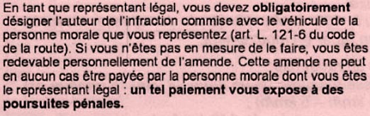 L’article L121-6 du code de la route est très clair : « Lorsqu’une (…) , le représentant légal de cette personne morale (…) ».